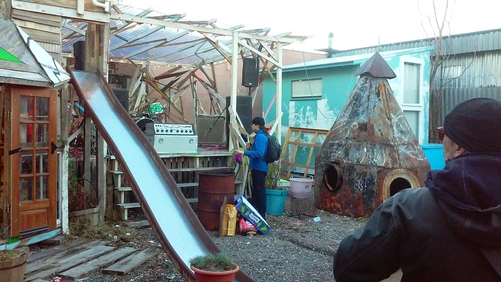 The frozen audience ranged from toddlers to those who looked like they’d been listening to electronic music since its early days. They warmed themselves over a wood fire that burned in a trash can in front of the stage. The movements of the band were obscure in the dim light but revealed the passion and dedication of the players. For roughly 30 minutes, the saxophones squonked and bleated on top of the propulsive, percussive dual-guitar attack. At times the drums offered a comfortable bed on which the other musicians could rest their contributions, while at other times it kicked their asses out of bed and drove them to work.