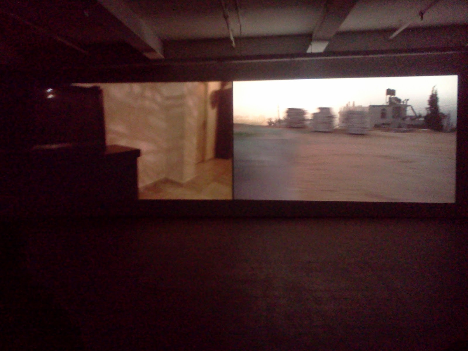 The projected videos, a collaboration of the artist and cinematographer Nida Sinnokrot, run for about 15 minutes but you’ll want to watch them at least twice to absorb the experience. Speakers transmit accompanying sounds of this environment, including the beeps of a truck backing up and the barking of dogs, creating an immersive experience. In addition to those images your attention will be drawn to a totem pole of monitors to your left and smaller pieces to your right.
