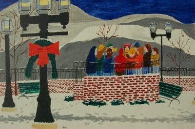 I took a painting class while I was in Oneonta and painted this scene of holiday carolers, including some of my fellow students and friends in the choir, singing on Main Street.