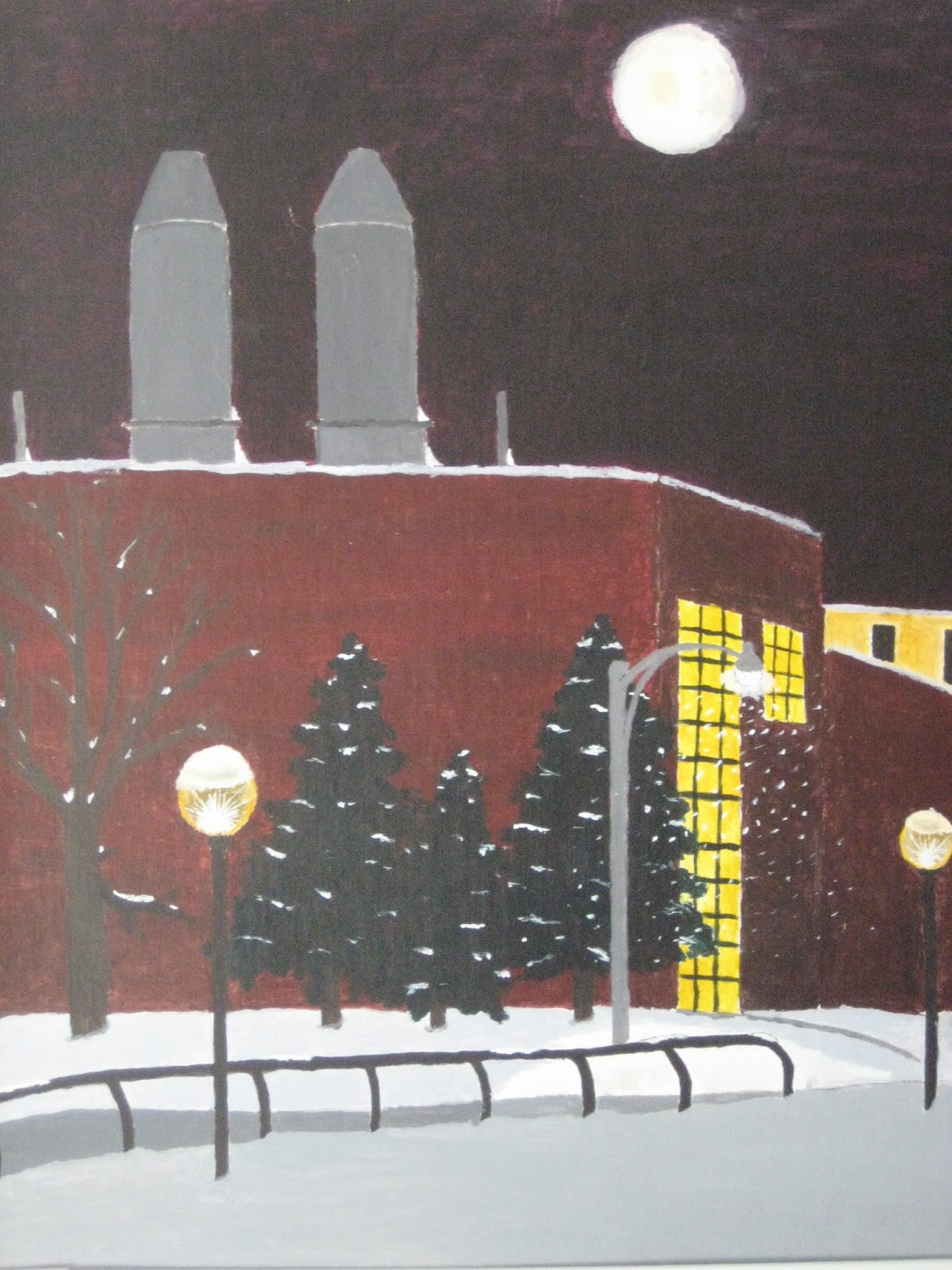 I also painted the view from my dorm, Golding Hall, up the hill into the light snowfall illuminated by the streetlight. I originally had Santa’s sleigh crossing the moon in this painting but my teacher advised me to paint him out. That was probably good advice.