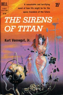 In The Sirens of Titan a man and woman are stranded together on one of Saturn’s moons for 20 years. At the age of 73, they fall in love. The man is the one who explains the meaning of life, to some sort of extraterrestrial robot, when he says, “It took us that long to realize a purpose of human life, no matter who is controlling it, is to love whoever is around to be loved.”