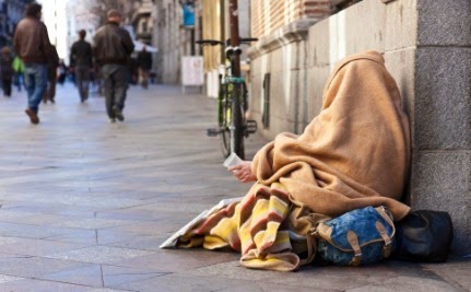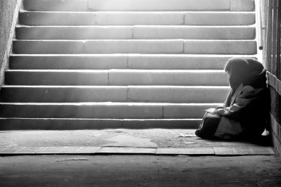 Three plastic bags. It’s all he’s got; it’s all he needs. He has a system to avoid the worst of the winter on his skin. He’s got a sweater in one of the bags.