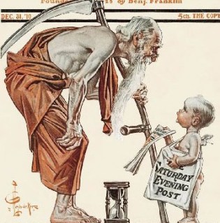 Father Time is growing old and Baby New Year is a drain on his energy. Father Time loves his baby notwithstanding.