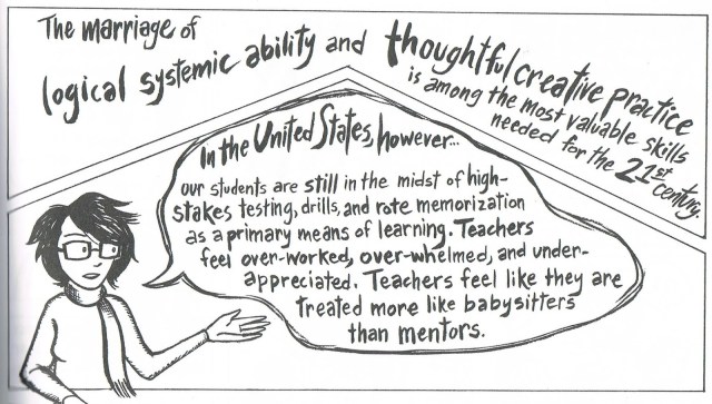 Choosing the graphic novel format to tell the story of her “Teacher’s Odyssey,” Branham perfectly illustrates the benefits of visual art in the communication of ideas. One of the ideas she champions is the liberating effect of art education on young and impressionable minds. She writes, “Art education is fundamentally based on play, on discovery and investigation – and having meaningful experiences!”