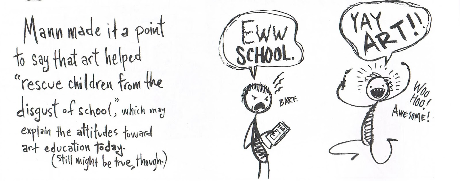 What’s So Great About Art Anyway does a great job of showcasing the ways art education benefit cognitive and social development, but it also sheds light on what it feels like to be a teacher in America today. Here is Branham’s description of the school as workplace: “The atmosphere feels fraught with anxiety and body odor. The same tensions tug at the students, and the same concerns poke at the teachers. It’s the same everywhere. The institution of formal education has hardly changed since its inception.”