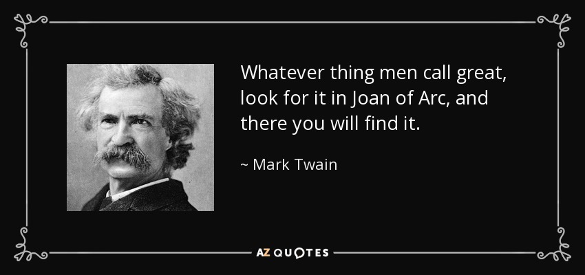 George Bernard Shaw, in the preface to his play Saint Joan, writes of Joan and Twain, “She makes her creator ridiculous, and yet, being the work of a man of genius, remains a credible human goodygoody in spite of her creator’s infatuation. Mark Twain writes his biography frankly in the form of a romance.”