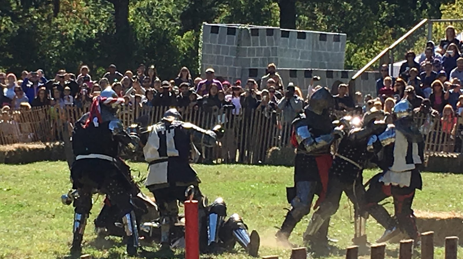 The Wikipedia entry for Medieval Weapons lists over 100 items including the horseman’s pick, the war scythe, and the hand cannon, sorted into categories like Siege Weapons, Spear and Polearms, and Trauma and Cleaving weapons. In Fort Tryon Park last weekend men representing New York City and Long Island bashed each others’ armored bodies with such ancient weapons.